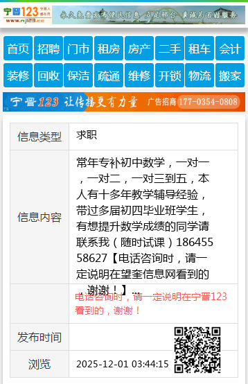 常年专补初中数学,一对一,一对二,一对三到五,本人有十多年教学辅导经验,带过多届初四毕业班学生,有想提升数学成绩的同学请联系我(随时试课)18645558627 【电话咨询时,请一定说明在望奎信息网看到的,谢谢!】 |