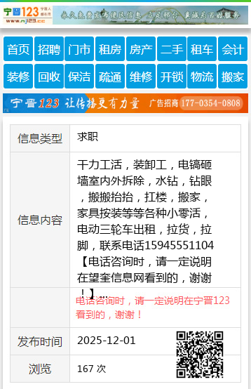 干力工活,装卸工,电镐砸墙室内外拆除,水钻,钻眼,搬搬抬抬,扛楼,搬家,家具按装等等各种小零活,电动三轮车出租,拉货,拉脚,联系电话15945551104