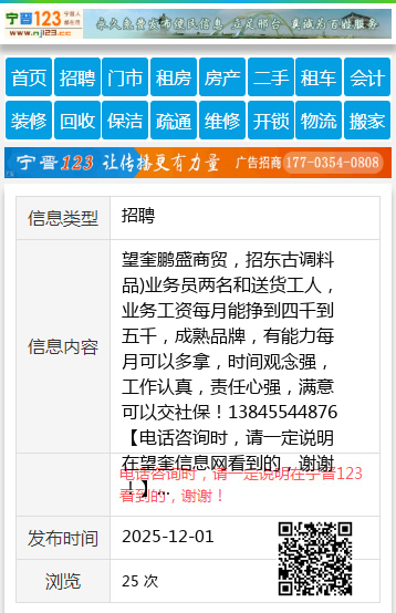 望奎鹏盛商贸,招东古调料品)业务员两名和送货工人,业务工资每月能挣到四千到五千,成熟品牌,有能力每月可以多拿,时间观念强,工作认真,责任心强,满意可以交社保!13845544876 【电话咨询时,请一定说明在望奎信息网看到的,谢谢!】 |