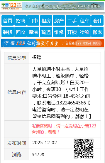 大量招聘小时主播,大量招聘小时工,超级简单,轻松,干完立刻结账!白天20一小时,夜班30一小时!工作要求:口齿伶俐 18-45岁之间,联系电话:13224654366 【电话咨询时,请一定说明在望奎信息网看到的,谢谢!】 |