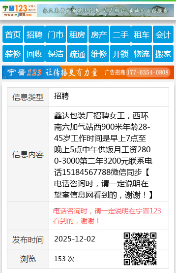 鑫达包装厂招聘女工,西环南六加气站西900米年龄28-45岁工作时间是早上7点至晚上5点中午供饭月工资2800-3000第二年3200元联系电话15184567788微信同步 【电话咨询时,请一定说明在望奎信息网看到的,谢谢!】 |