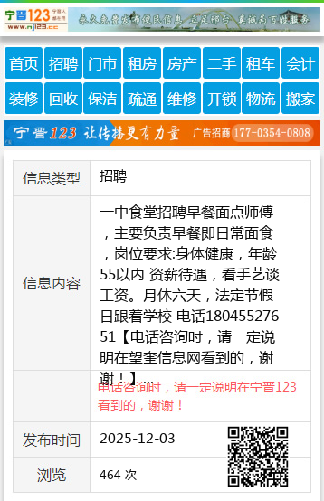 一中食堂招聘早餐面点师傅,主要负责早餐即日常面食,岗位要求:身体健康,年龄55以内 资薪待遇,看手艺谈工资。月休六天,法定节假日跟着学校 电话18045527651 【电话咨询时,请一定说明在望奎信息网看到的,谢谢!】 |