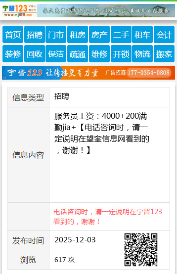 [庆祝]麦香手工面条[庆祝]招: 服务员一名(40岁以内) 钟点工一名(40岁以内) 地址:南三道街县委斜对面 电话:15765208399