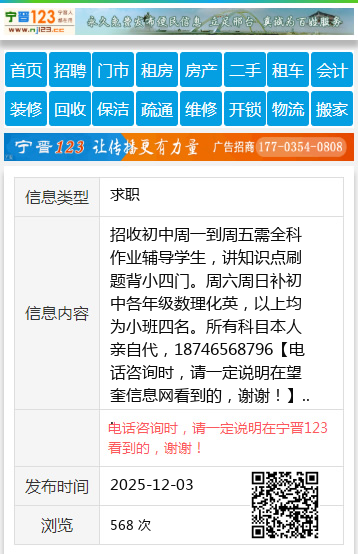 招收初中周一到周五需全科作业辅导学生,讲知识点刷题背小四门。周六周日补初中各年级数理化英,以上均为小班四名。所有科目本人亲自代,18746568796 【电话咨询时,请一定说明在望奎信息网看到的,谢谢!】 |
