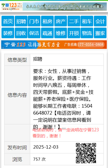 要求:女性,从事过销售,服务行业。薪资待遇:工作时间早八晚五,每周单休,四天带薪假。底薪+奖金+技能薪+养老保险+医疗保险。能够长期工作者电联:15046648072 【电话咨询时,请一定说明在望奎信息网看到的,谢谢!】 |