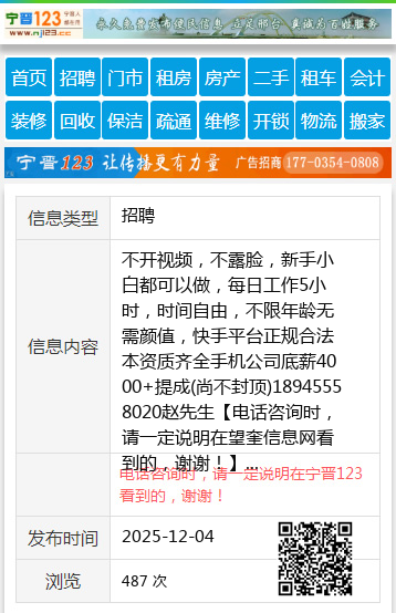 不开视频,不露脸,新手小白都可以做,每日工作5小时,时间自由,不限年龄无需颜值,快手平台正规合法本资质齐全手机公司底薪4000+提成(尚不封顶)18945558020赵先生 【电话咨询时,请一定说明在望奎信息网看到的,谢谢!】 |
