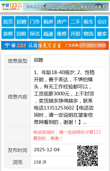 1、年龄18-40周岁; 2、性格开朗,善于表达,不惧怕镜头,有无工作经验都可以,工资底薪3000元,上不封顶,卖货越多挣得越多,联系电话13351253602 【电话咨询时,请一定说明在望奎信息网看到的,谢谢!】 |