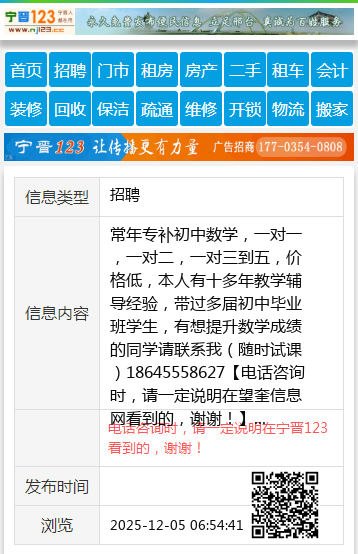 常年专补初中数学,一对一,一对二,一对三到五,价格低,本人有十多年教学辅导经验,带过多届初中毕业班学生,有想提升数学成绩的同学请联系我(随时试课)18645558627 【电话咨询时,请一定说明在望奎信息网看到的,谢谢!】 |
