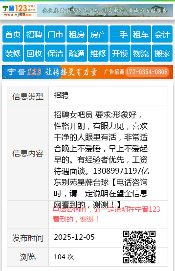 招聘女吧员 要求:形象好,性格开朗,有眼力见,喜欢干净的人眼里有活,非常适合晚上不爱睡,早上不爱起早的。有经验者优先,工资待遇面谈。13089971197亿东别苑星牌台球 【电话咨询时,请一定说明在望奎信息网看到的,谢谢!】 |