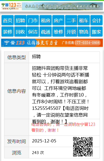 招聘抖音团购带货主播非常轻松 十分钟说两句话不断播就可以,打着游戏追着剧都可以 工作环境空调地暖都有冬暖夏凉,工作时薪10,工作8小时周结!不压工资!15255545507 【电话咨询时,请一定说明在望奎信息网看到的,谢谢!】 |