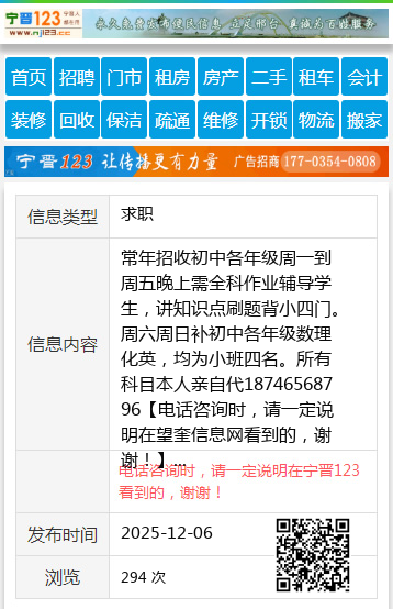 常年招收初中各年级周一到周五晚上需全科作业辅导学生,讲知识点刷题背小四门。周六周日补初中各年级数理化英,均为小班四名。所有科目本人亲自代18746568796 【电话咨询时,请一定说明在望奎信息网看到的,谢谢!】 |