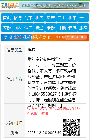 常年专补初中数学,一对一,一对二,一对三到五,价格低,本人有十多年教学辅导经验,带过多届初中毕业班学生,有想提升数学成绩的同学请联系我(随时试课)18645558627 【电话咨询时,请一定说明在望奎信息网看到的,谢谢!】 |