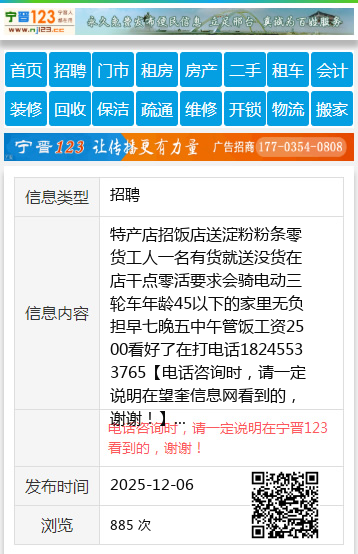 特产店招饭店送淀粉粉条零货工人一名有货就送没货在店干点零活要求会骑电动三轮车年龄45以下的家里无负担早七晚五中午管饭工资2500看好了在打电话18245533765 【电话咨询时,请一定说明在望奎信息网看到的,谢谢!】 |