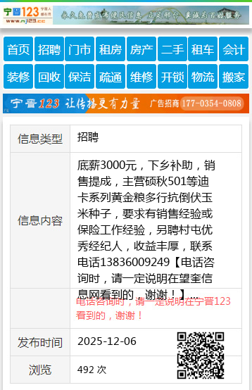 底薪3000元,下乡补助,销售提成,主营硕秋501等迪卡系列黄金粮多行抗倒伏玉米种子,要求有销售经验或保险工作经验,另聘村屯优秀经纪人,收益丰厚,联系电话13836009249 【电话咨询时,请一定说明在望奎信息网看到的,谢谢!】 |