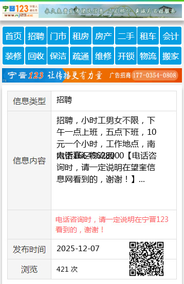 招聘,小时工男女不限,下午一点上班,五点下班,10元一个小时,工作地点,南六街嘉汇物流园 电话16645628000