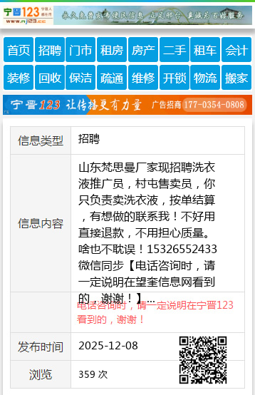 山东梵思曼厂家现招聘洗衣液推广员,村屯售卖员,你只负责卖洗衣液,按单结算,有想做的联系我!不好用直接退款,不用担心质量。啥也不耽误!15326552433微信同步 【电话咨询时,请一定说明在望奎信息网看到的,谢谢!】 |