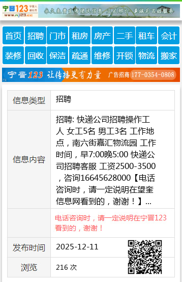 招聘: 快递公司招聘操作工人 女工5名 男工3名 工作地点,南六街嘉汇物流园 工作时间,早7:00晚5:00 快递公司招聘客服 工资2500-3500,咨询16645628000 【电话咨询时,请一定说明在望奎信息网看到的,谢谢!】 |