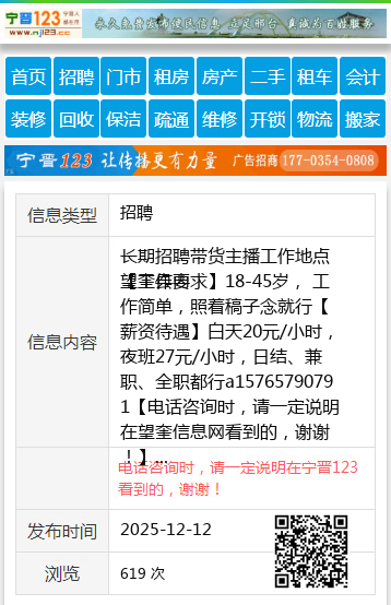 【工作要求】18-45岁, 工作简单,照着稿子念就行【薪资待遇】白天20元/小时,夜班27元/小时,日结、兼职、全职都行a15765790791 【电话咨询时,请一定说明在望奎信息网看到的,谢谢!】 |