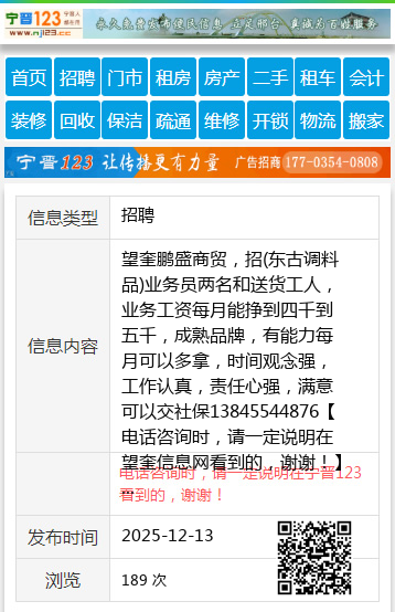 望奎鹏盛商贸,招(东古调料品)业务员两名和送货工人,业务工资每月能挣到四千到五千,成熟品牌,有能力每月可以多拿,时间观念强,工作认真,责任心强,满意可以交社保13845544876 【电话咨询时,请一定说明在望奎信息网看到的,谢谢!】 |