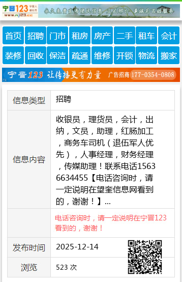 收银员,理货员,会计,出纳,文员,助理,红肠加工,商务车司机(退伍军人优先),人事经理,财务经理,传媒助理!联系电话15636634455 【电话咨询时,请一定说明在望奎信息网看到的,谢谢!】 |