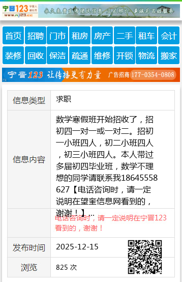 数学寒假班开始招收了,招初四一对一或一对二。招初一小班四人,初二小班四人,初三小班四人。本人带过多届初四毕业班,数学不理想的同学请联系我18645558627 【电话咨询时,请一定说明在望奎信息网看到的,谢谢!】 |