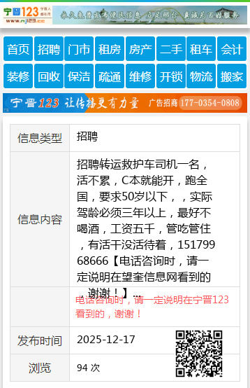 招聘转运救护车司机一名,活不累,C本就能开,跑全国,要求50岁以下,,实际驾龄必须三年以上,最好不喝酒,工资五千,管吃管住,有活干没活待着,15179968666 【电话咨询时,请一定说明在望奎信息网看到的,谢谢!】 |