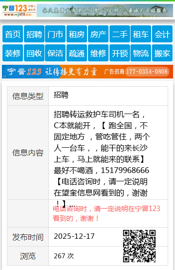 招聘转运救护车司机一名,C本就能开,【 跑全国,不固定地方 ,管吃管住,两个人一台车,,能干的来长沙上车,马上就能来的联系】最好不喝酒,15179968666 【电话咨询时,请一定说明在望奎信息网看到的,谢谢!】 |