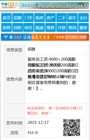 | 防骗提醒: | 望奎信息网(www.wangkui.cc)提醒您:手工活、网络兼职、刷单,都是骗子!凡以各种名义收取费用的都是骗子!找工作是往兜里挣钱,让你往外掏钱的都是骗子!异地招聘请提高警惕,谨防诈骗! |
