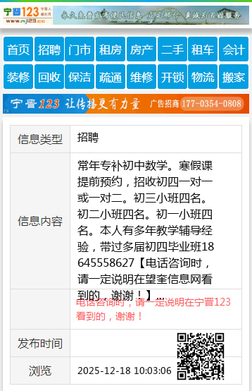 常年专补初中数学。寒假课提前预约,招收初四一对一或一对二。初三小班四名。初二小班四名。初一小班四名。本人有多年教学辅导经验,带过多届初四毕业班18645558627 【电话咨询时,请一定说明在望奎信息网看到的,谢谢!】 |