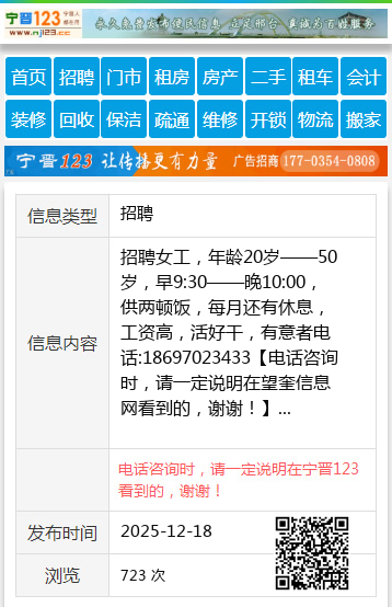 招聘女工,年龄20岁——50岁,早9:30——晚10:00,供两顿饭,每月还有休息,工资高,活好干,有意者电话:18697023433 【电话咨询时,请一定说明在望奎信息网看到的,谢谢!】 |
