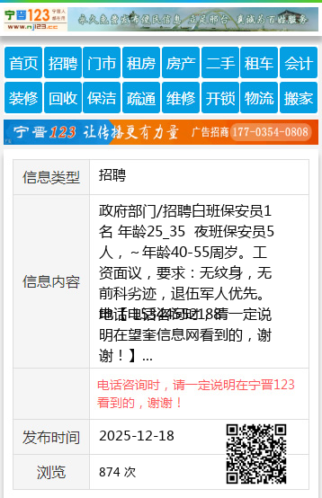 政府部门/招聘白班保安员1名 年龄25_35 夜班保安员5人,~年龄40-55周岁。工资面议,要求:无纹身,无前科劣迹,退伍军人优先。电话 15344552188