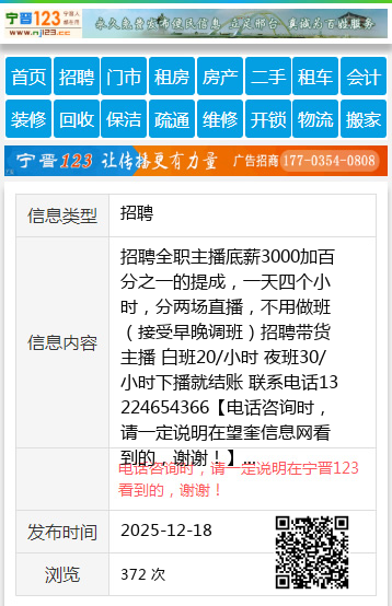 招聘全职主播底薪3000加百分之一的提成,一天四个小时,分两场直播,不用做班(接受早晚调班)招聘带货主播 白班20/小时 夜班30/小时下播就结账 联系电话13224654366 【电话咨询时,请一定说明在望奎信息网看到的,谢谢!】 |