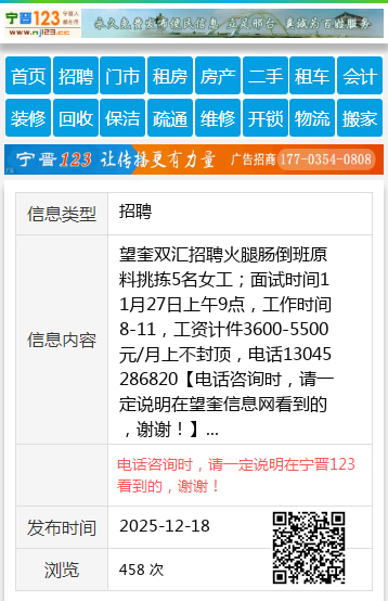 望奎双汇招聘火腿肠倒班原料挑拣5名女工;面试时间11月27日上午9点,工作时间8-11,工资计件3600-5500元/月上不封顶,电话13045286820 【电话咨询时,请一定说明在望奎信息网看到的,谢谢!】 |