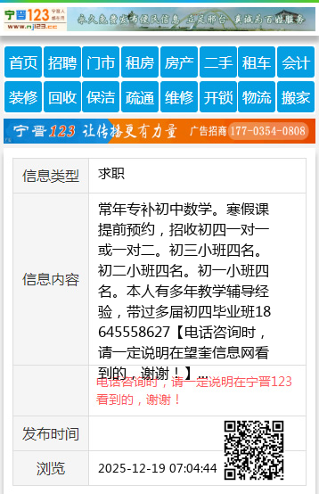 常年专补初中数学。寒假课提前预约,招收初四一对一或一对二。初三小班四名。初二小班四名。初一小班四名。本人有多年教学辅导经验,带过多届初四毕业班18645558627 【电话咨询时,请一定说明在望奎信息网看到的,谢谢!】 |