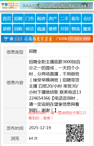 招聘全职主播底薪3000加百分之一的提成,一天四个小时,分两场直播,不用做班(接受早晚调班)招聘带货主播 白班20/小时 夜班30/小时下播就结账 联系电话13224654366 【电话咨询时,请一定说明在望奎信息网看到的,谢谢!】 |