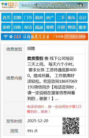 找卖货销 售 线下公司培训 三天上岗。 每天六个小时。 要求女孩 工资待遇底薪4000。提成另算。 工作氛围好活轻松。欢迎咨询18697069191微信同步 【电话咨询时,请一定说明在望奎信息网看到的,谢谢!】 |
