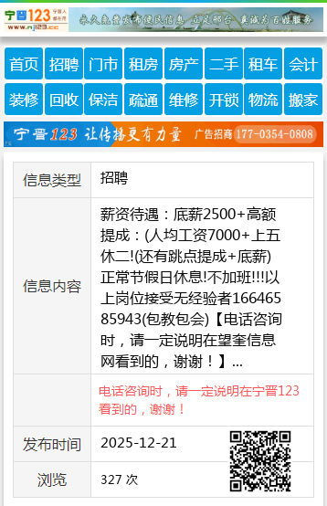 薪资待遇:底薪2500+高额提成:(人均工资7000+上五休二!(还有跳点提成+底薪)正常节假日休息!不加班!!!以上岗位接受无经验者16646585943(包教包会) 【电话咨询时,请一定说明在望奎信息网看到的,谢谢!】 |