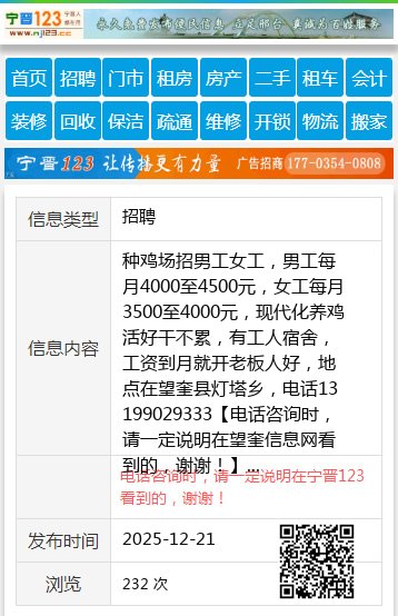种鸡场招男工女工,男工每月4000至4500元,女工每月3500至4000元,现代化养鸡活好干不累,有工人宿舍,工资到月就开老板人好,地点在望奎县灯塔乡,电话13199029333 【电话咨询时,请一定说明在望奎信息网看到的,谢谢!】 |