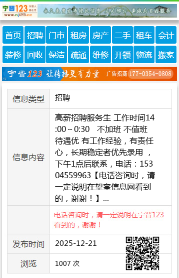 高薪招聘服务生 工作时间14:00~0:30 不加班 不值班 待遇优 有工作经验,有责任心,长期稳定者优先录用 ,下午1点后联系,电话:15304559963 【电话咨询时,请一定说明在望奎信息网看到的,谢谢!】 |