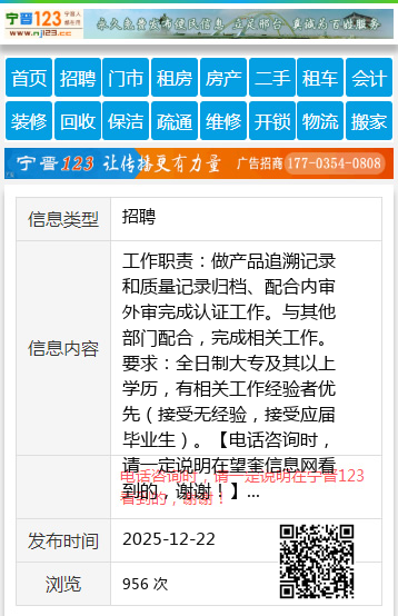 工作职责:做产品追溯记录和质量记录归档、配合内审外审完成认证工作。与其他部门配合,完成相关工作。要求:全日制大专及其以上学历,有相关工作经验者优先(接受无经验,接受应届毕业生)。 【电话咨询时,请一定说明在望奎信息网看到的,谢谢!】 |