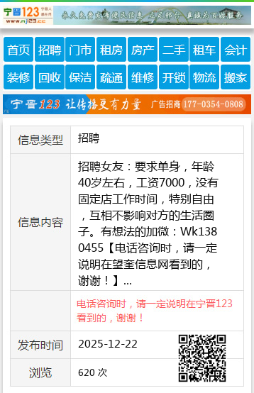 招聘女友:要求单身,年龄40岁左右,工资7000,没有固定店工作时间,特别自由,互相不影响对方的生活圈子。有想法的加微:Wk1380455 【电话咨询时,请一定说明在望奎信息网看到的,谢谢!】 |