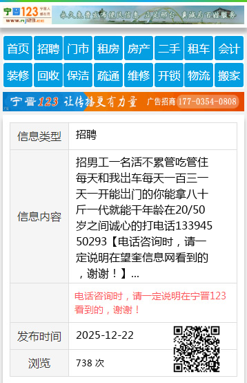 招男工一名活不累管吃管住每天和我岀车每天一百三一天一开能岀门的你能拿八十斤一代就能干年龄在20/50岁之间诚心的打电话13394550293 【电话咨询时,请一定说明在望奎信息网看到的,谢谢!】 |