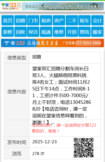 望奎双汇招聘分割车间长白班3人、火腿肠倒班原料挑拣4名女工;面试时间11月25日下午14点,工作时间8-11,工资计件3500-7000元/月上不封顶,电话13045286820 【电话咨询时,请一定说明在望奎信息网看到的,谢谢!】 |