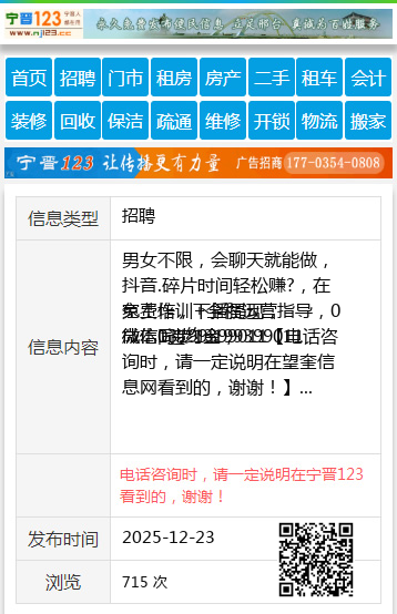 | 防骗提醒: | 望奎信息网(www.wangkui.cc)提醒您:手工活、网络兼职、刷单,都是骗子!凡以各种名义收取费用的都是骗子!找工作是往兜里挣钱,让你往外掏钱的都是骗子!异地招聘请提高警惕,谨防诈骗! |