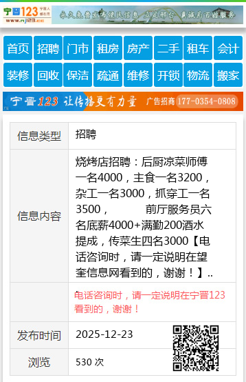 烧烤店招聘:后厨凉菜师傅一名4000,主食一名3200,杂工一名3000,抓穿工一名3500, 前厅服务员六名底薪4000+满勤200酒水提成,传菜生四名3000 【电话咨询时,请一定说明在望奎信息网看到的,谢谢!】 |