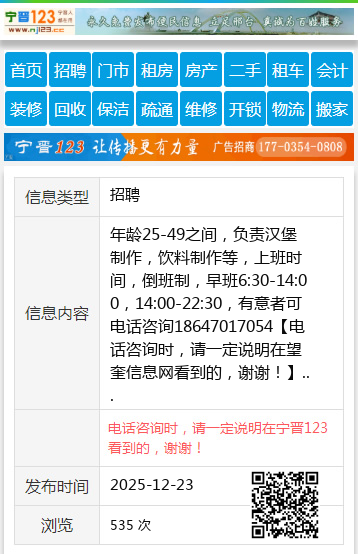 年龄25-49之间,负责汉堡制作,饮料制作等,上班时间,倒班制,早班6:30-14:00,14:00-22:30,有意者可电话咨询18647017054 【电话咨询时,请一定说明在望奎信息网看到的,谢谢!】 |
