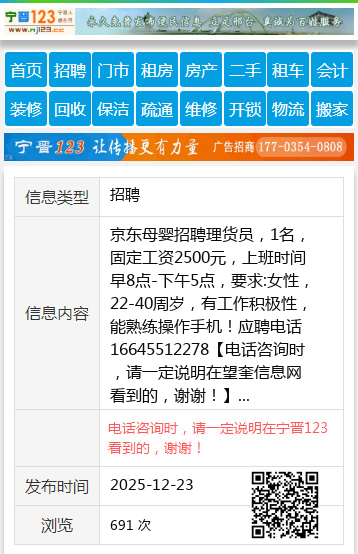 京东母婴招聘理货员,1名,固定工资2500元,上班时间早8点-下午5点,要求:女性,22-40周岁,有工作积极性,能熟练操作手机!应聘电话16645512278 【电话咨询时,请一定说明在望奎信息网看到的,谢谢!】 |