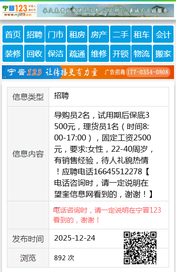 导购员2名,试用期后保底3500元,理货员1名(时间8:00-17:00),固定工资2500元,要求:女性,22-40周岁,有销售经验,待人礼貌热情!应聘电话16645512278 【电话咨询时,请一定说明在望奎信息网看到的,谢谢!】 |