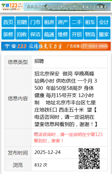 招北京保安 做岗 早晚高峰站俩小时 供吃供住 一个月 3500 年龄50至58周岁 身体健康 每月15号开支 12小时制 地址北京市丰台区七里庄地铁E口 西走五十米 望 【电话咨询时,请一定说明在望奎信息网看到的,谢谢!】 |