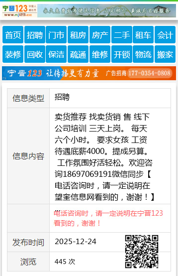 | 防骗提醒: | 望奎信息网(www.wangkui.cc)提醒您:手工活、网络兼职、刷单,都是骗子!凡以各种名义收取费用的都是骗子!找工作是往兜里挣钱,让你往外掏钱的都是骗子!异地招聘请提高警惕,谨防诈骗! |